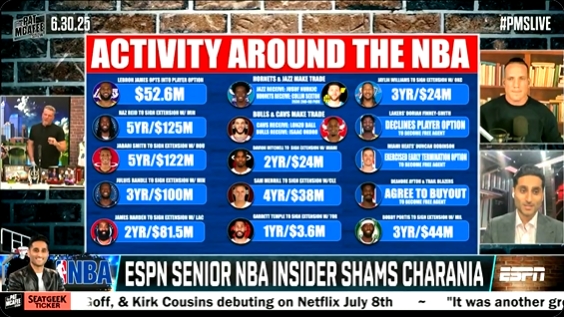 07月01日讯 名记Shams在播客节目《PatMcfeeShow》的直播中连续说了两遍:“(当地时间)今晚会有大交易,今晚会有大交易(There's gonna be some BIG deals tonight)!”