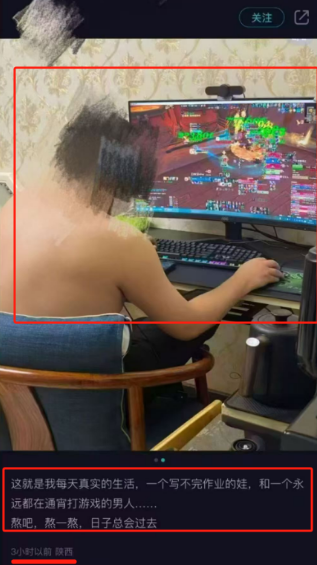 动态里,女用户配文道:这就是我每天的真实生活,一个写不完作业的娃,和一个永远都在通宵打游戏的男人….“