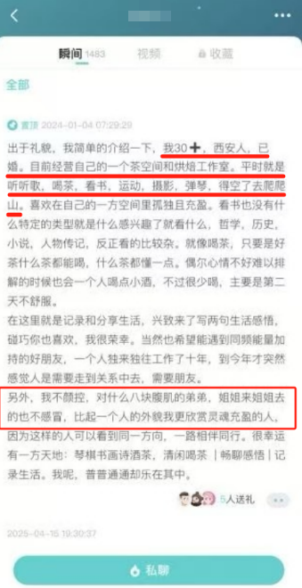 而她的个人介绍也十分直白,大方承认自己已婚,还经营着茶馆和面包房,平日里就是听歌、喝茶、看书、运动、摄影、弹琴,闲时爬山。